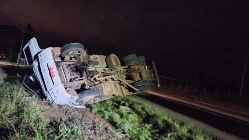 Caminhão com placas de Cruz Machado tomba na BR-280 em Canoinhas