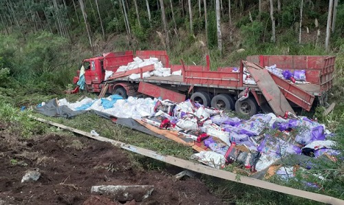 Conforme informações, um caminhão Scania/T113 de cor vermelha, acabou saindo da pista e caiu em uma ribanceira, ficando parcialmente destruído e espalhando a carga às margens da rodovia.
