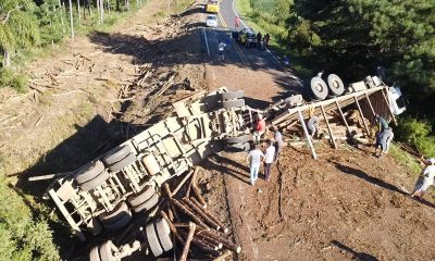 Local19 horas atrásCaminhão carregado com toras de pinus tomba na BR-153 e interdita pista em Mallet
