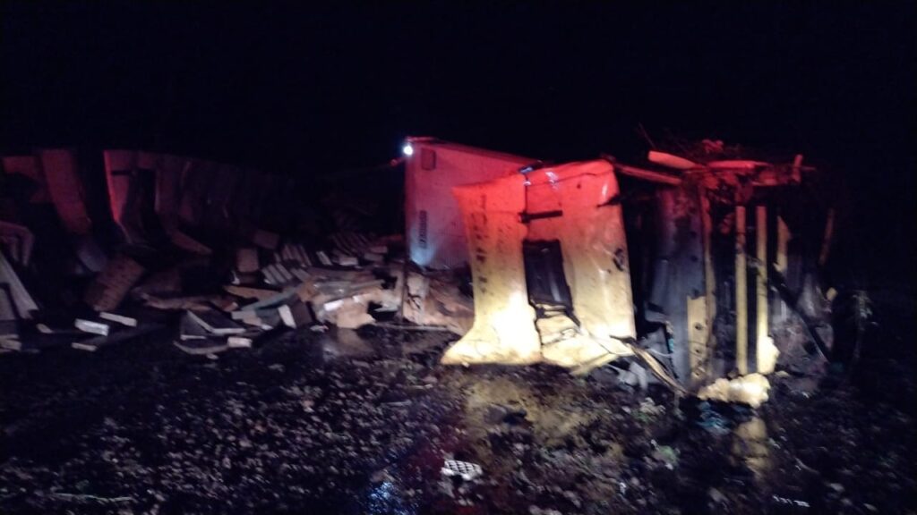 A primeira ocorrência foi registrada de 03:30 horas envolvendo uma carreta Scania R/114 de cor amarela, que acabou tombando na pista e espalhando uma carga de móveis. O condutor de 35 anos, sofreu ferimentos moderados e foi socorrido e encaminhado ao Pronto Atendimento Municipal.