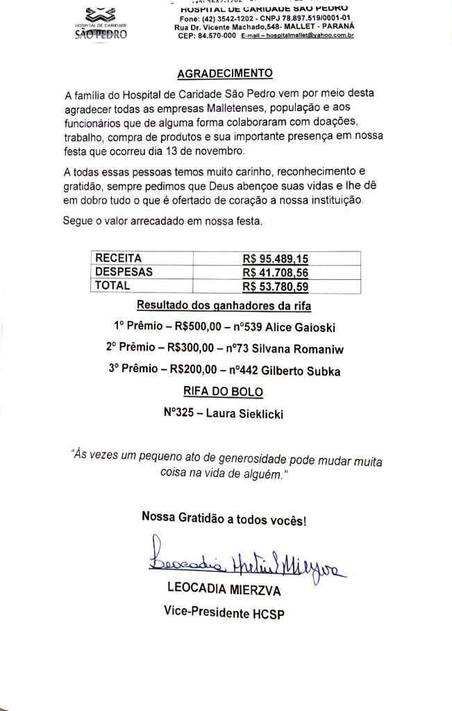 Confira o resultado da festa do Hospital de Caridade São Pedro de Mallet