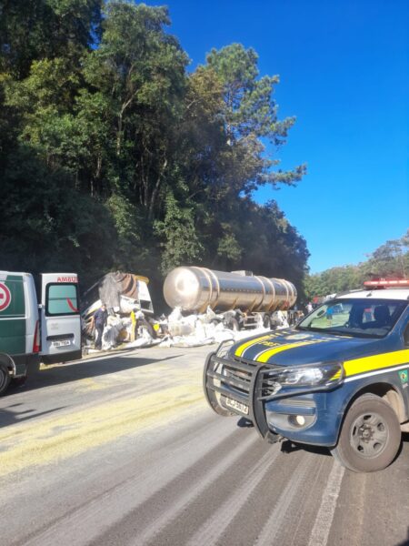 CAMINHÃO TOMBA NA BR-153 ENTRE UNIÃO DA VITÓRIA E GENERAL CARNEIRO