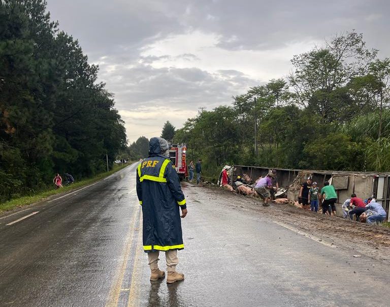 CAMINHÃO CARREGADO COM 230 PORCOS TOMBA NA BR-153