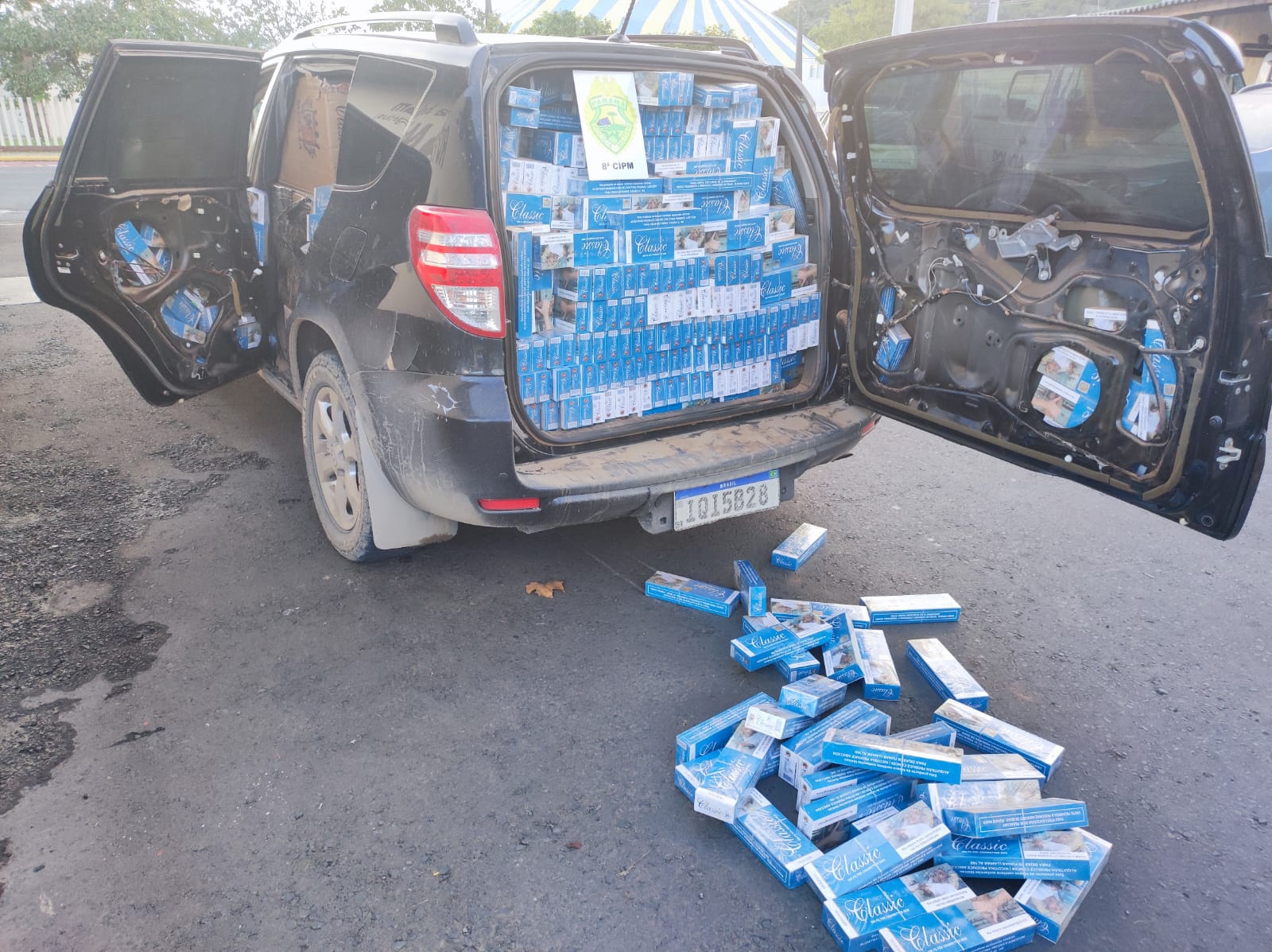 Por volta das 17h, equipes da 8ª CIPM realizavam patrulhamento na região quando abordaram um veículo suspeito. Durante a vistoria, os policiais localizaram cerca de 40 caixas de cigarros de origem estrangeira, totalizando aproximadamente 20 mil maços.