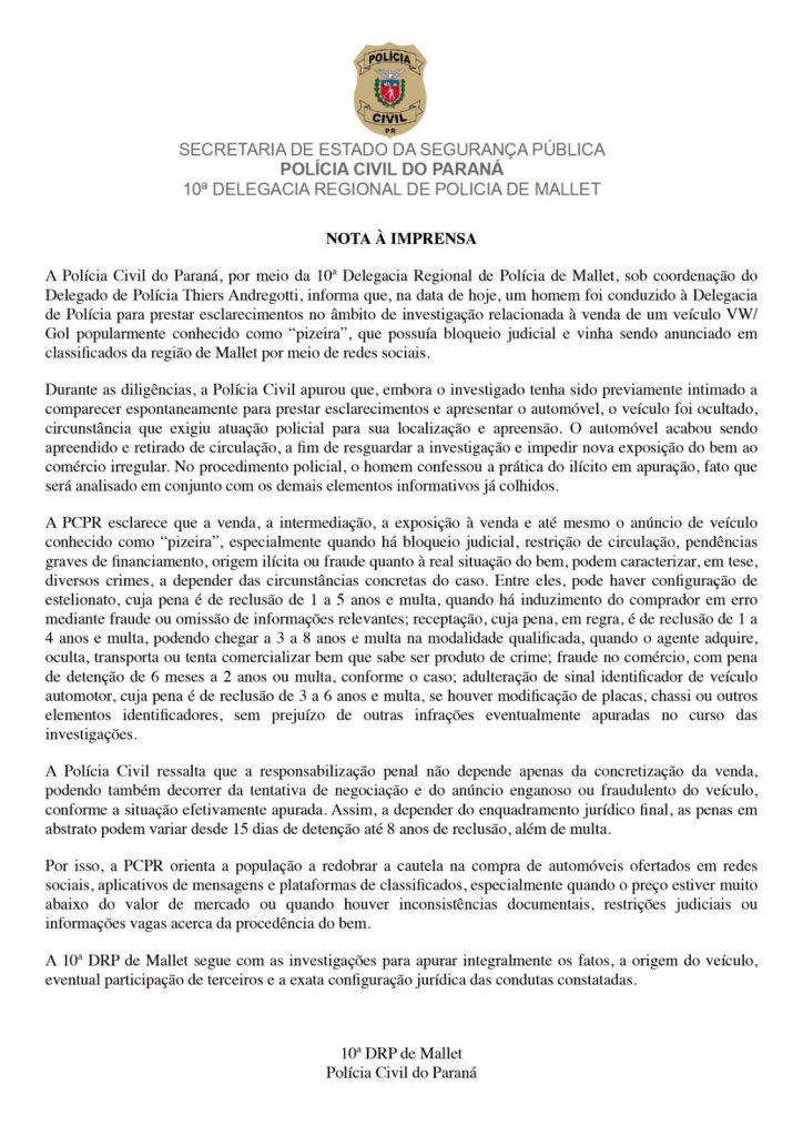 Um dos casos investigados envolve um homem que foi conduzido à delegacia para prestar esclarecimentos sobre a venda de um veículo VW/Gol, popularmente conhecido como “pizeira”, que possuía bloqueio judicial e vinha sendo anunciado na região. Segundo a PCPR, o investigado já havia sido intimado a comparecer espontaneamente e apresentar o automóvel, porém o veículo foi ocultado, o que exigiu diligências policiais para sua localização.