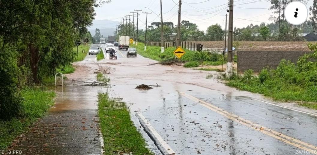O temporal também provocou a queda de galhos de árvores na BR-476, próximo ao Posto Mallon, bloqueando parcialmente a pista e o acostamento.