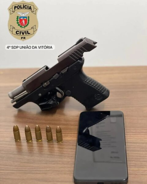 Além disso, a equipe policial também cumpriu um mandado de busca e apreensão na residência do investigado, onde foi localizada e apreendida a arma utilizada em um dos crimes: uma pistola calibre 9mm, de uso restrito, com cinco munições.