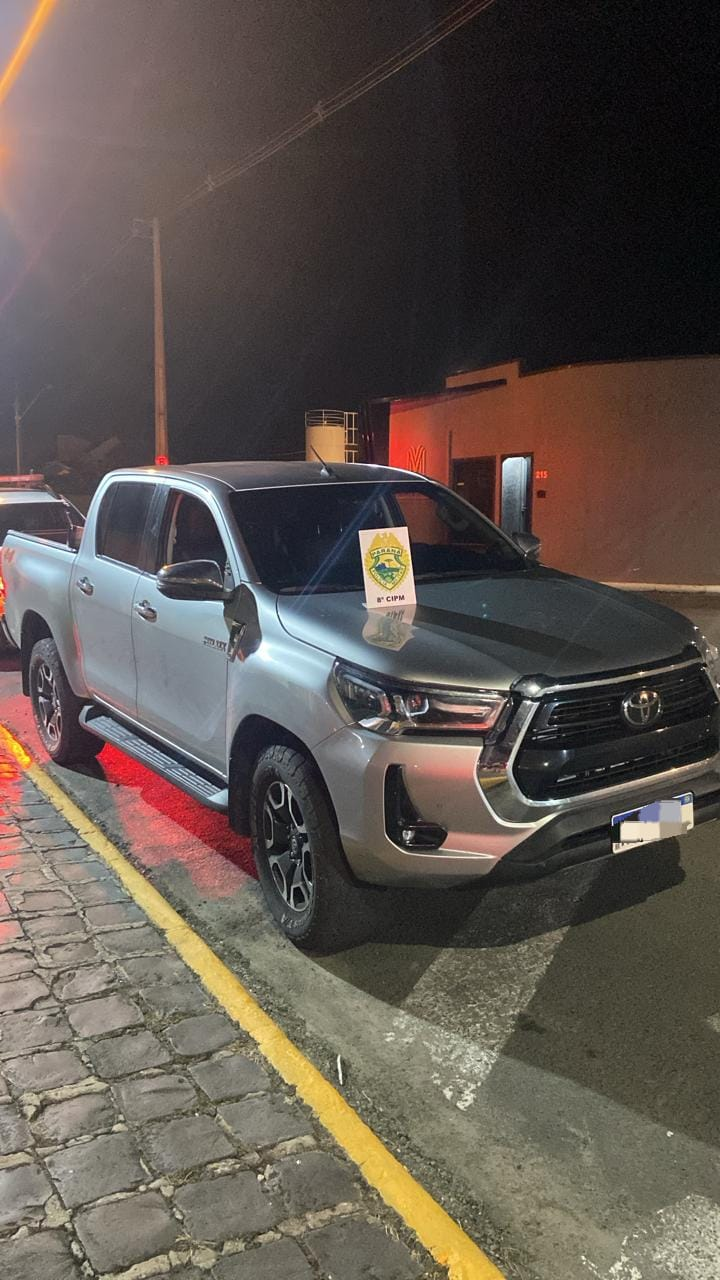 Operação coordenada pela Polícia Militar resultou na apreensão de uma caminhonete Toyota Hilux com placas clonadas, em uma ação que envolveu o deslocamento por várias localidades na região de Irati por volta das 23:40 horasd a noite desse sábado (04).