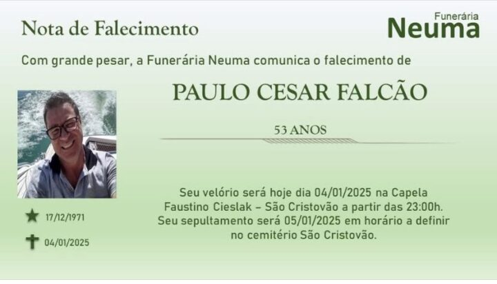 Ele será velado na Capela Faustino Cieslak, com início previsto para as 21h deste sábado. O sepultamento será realizado no domingo, 5 de janeiro, em horário a ser definido pela família.