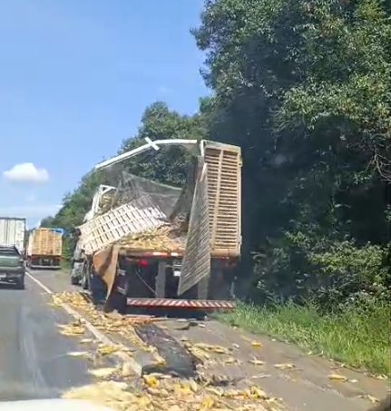 Motoristas que passam pelo trecho devem redobrar a atenção devido à presença da carga na pista.