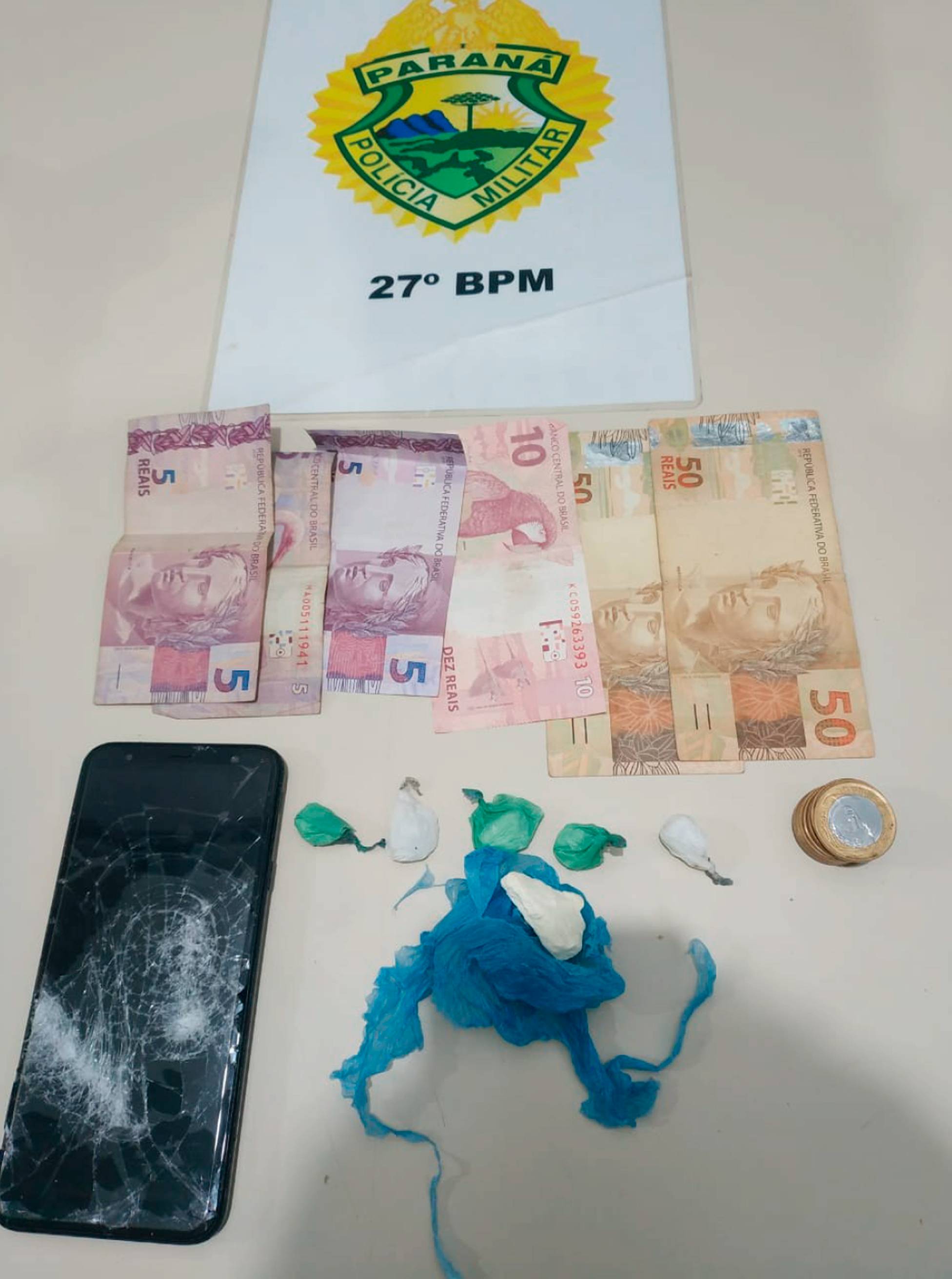 O terceiro foi abordado, nada de ilícito foi encontrado em sua posse. Em busca domiciliar, os policiais localizaram seis invólucros transparentes contendo substância análoga à cocaína.