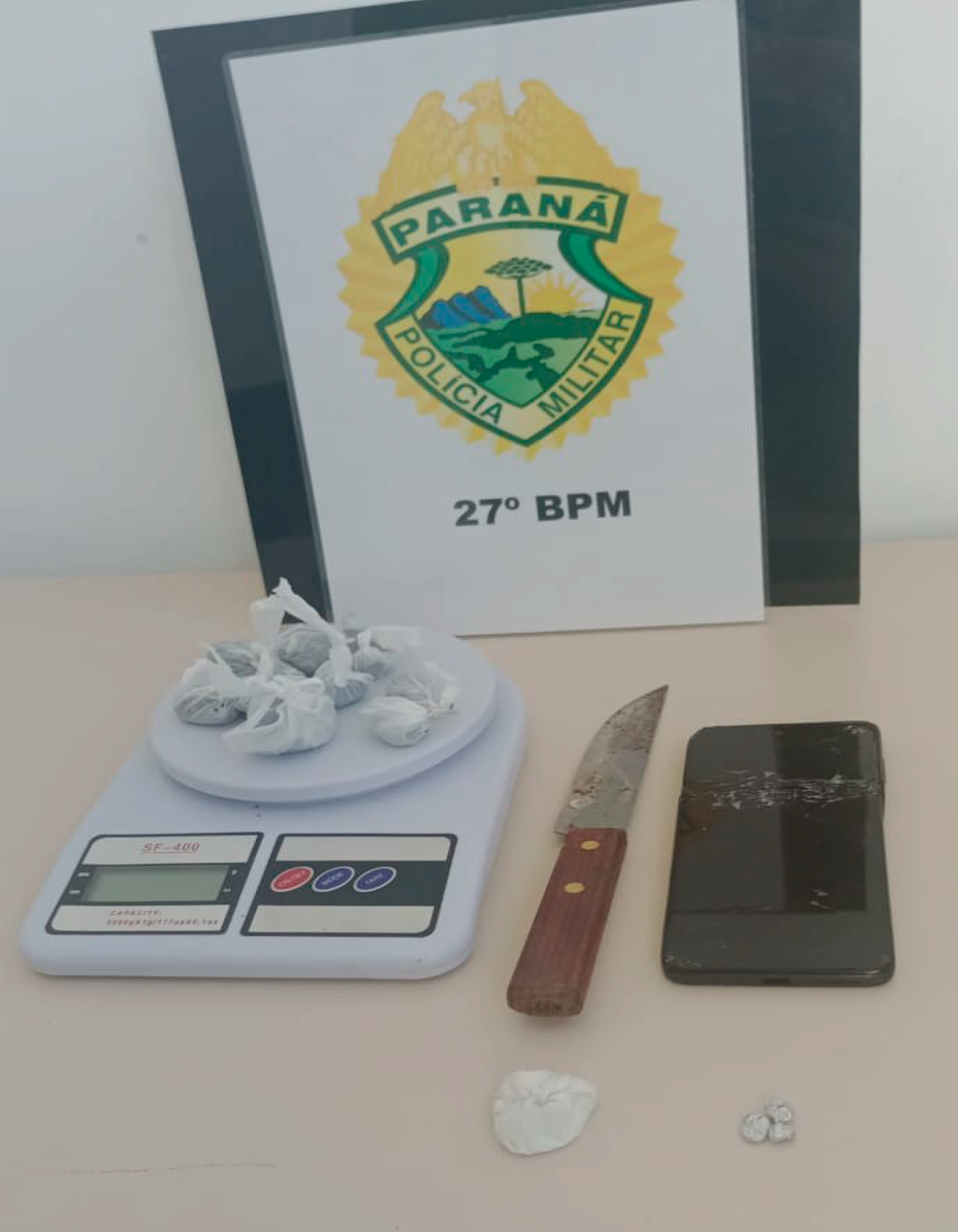 No local foi abordado um homem e durante a busca domiciliar foi encontrado uma faca com resquícios de fracionamento de entorpecentes, balança de precisão, substâncias análogas a maconha, cocaína e crack.