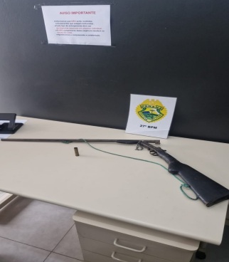 A equipe iniciou buscas e localizou o suspeito ainda próximo da arma, uma espingarda calibre 32 aparentemente sem marca. Com ele, foram apreendidas também uma munição intacta no cano e outras cinco munições em uma bolsa. O homem foi preso e encaminhado à Delegacia de Polícia para os procedimentos legais.