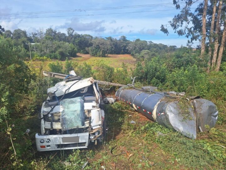 Caminhão-tanque tomba após sair da pista e atingir poste entre Major Vieira e Papanduva