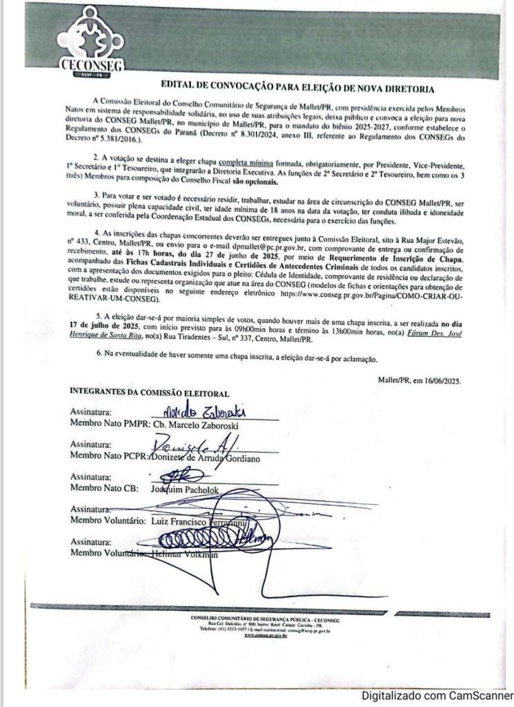 ELEIÇÃO PARA NOVA DIRETORIA DO CONSEG MALLET – BIÊNIO 2025-2027