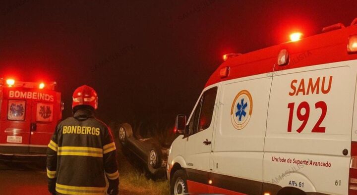 O veículo envolvido capotou e deixou dois homens feridos. Um deles ficou preso sob o carro e precisou ser resgatado pelos bombeiros. A vítima apresentava escoriações e uma possível fratura no braço direito, sendo socorrida em estado estável pela equipe do SAMU – Alfa 61.