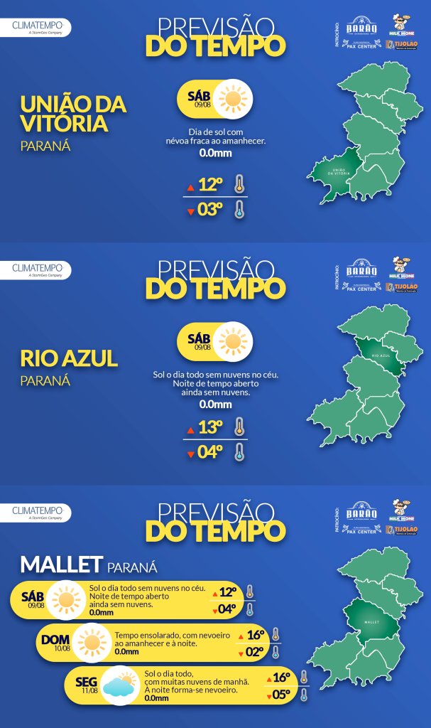 CONFIRA A PREVISÃO DO TEMPO PARA MALLET E REGIÃO PARA ESTE SÁBADO (09/08)