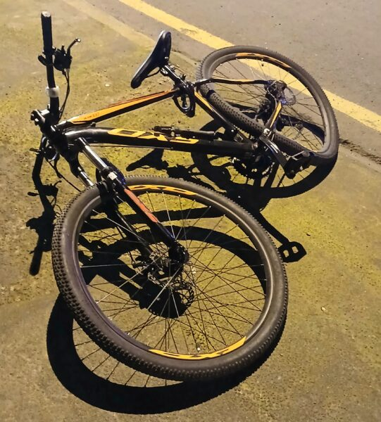 A batida envolveu uma motocicleta Honda, de cor preta, e uma bicicleta preta e laranja. A ciclista, que ficou ferida, apresentava suspeita de fratura em um dos braços.