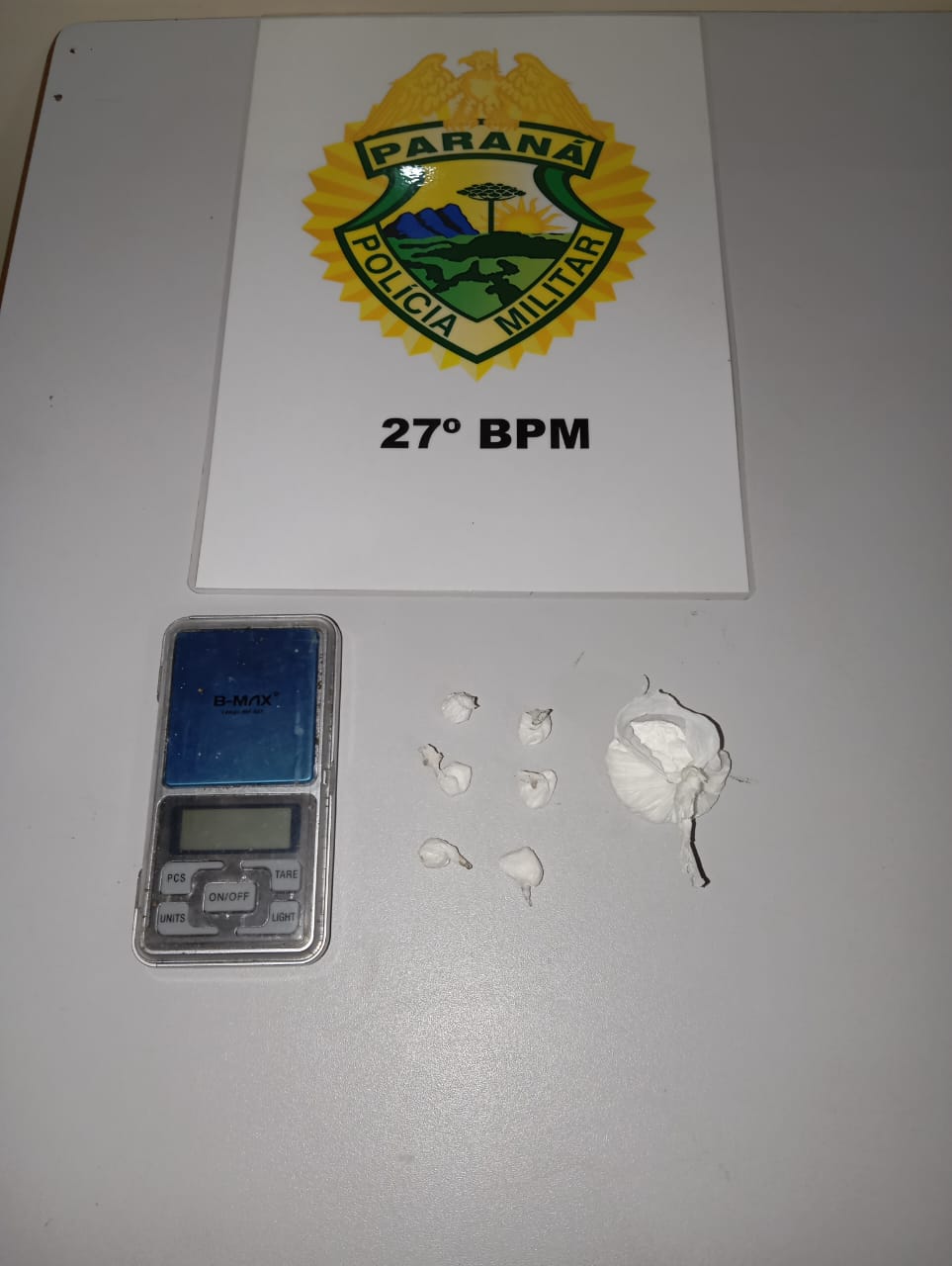 Foi procedida a abordagem, sendo localizadas algumas porções de substância análoga à cocaína, além de uma balança de precisão.
