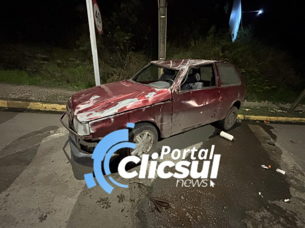 m Fiat Uno vermelho tombou após o condutor perder o controle da direção e colidir contra um poste de ferro nas proximidades da cabeceira da ponte do Rio Iguaçu, em São Mateus do Sul na noite deste domingo (07).