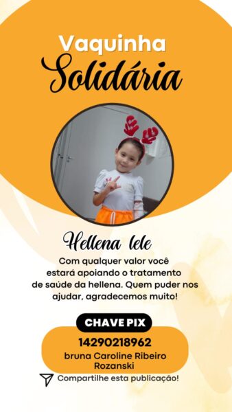 Cada contribuição, por menor que seja, fará a diferença na vida da pequena guerreira. Para quem não puder colaborar financeiramente, a família pede que a história de Hellena seja compartilhada para que mais pessoas possam se mobilizar.
