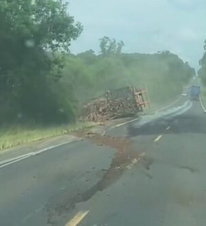 No local, os socorristas verificaram que uma carreta bitrem carregada com toras de madeira havia tombado no acostamento, deixando parte da composição sobre a pista de rolamento. O cavalo mecânico Scania R560 foi encontrado cerca de 200 metros à frente, já estacionado.