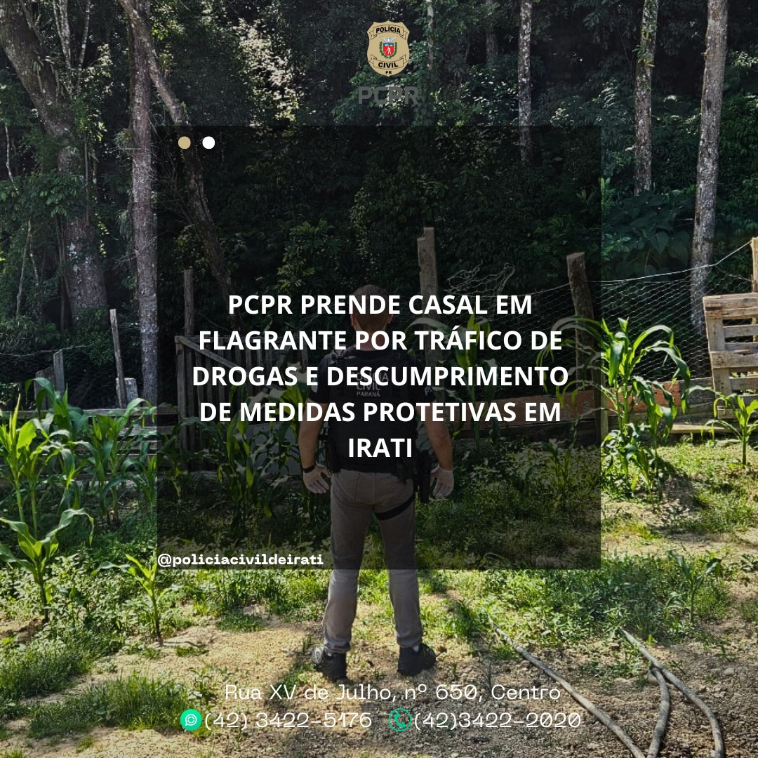 A Polícia Civil do Paraná (PCPR), através da 41ª Delegacia Regional de Polícia de Irati, em ação realizada na tarde desta quarta-feira (04/12/2025), prendeu em flagrante uma mulher (36 anos) e um homem (28 anos), pelos crimes de Tráfico de Drogas e Descumprimento de Medidas Protetivas de Urgência. Os fatos ocorreram na Rua Coronel Pires, no Bairro Centro.