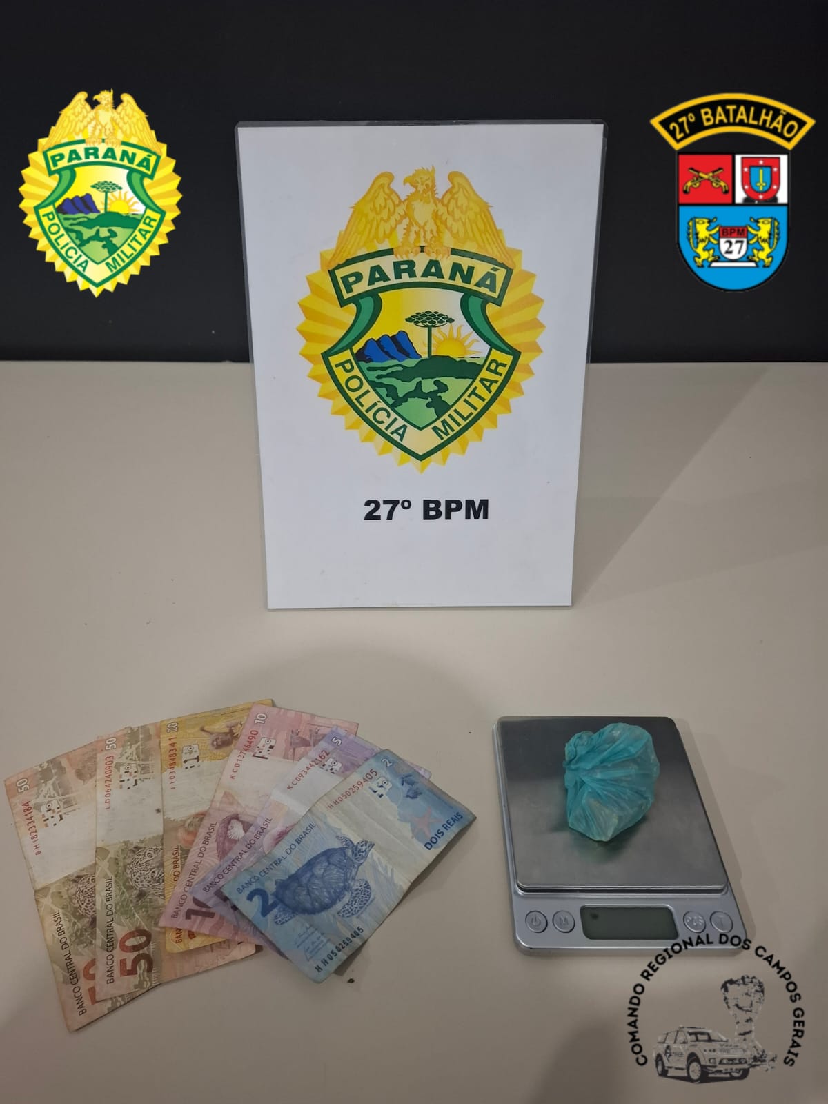 Durante revista foi encontrado um invólucro contendo substância análoga ao crack, além de dinheiro. O material foi apreendido e o fato encaminhado para apreciação da autoridade competente.