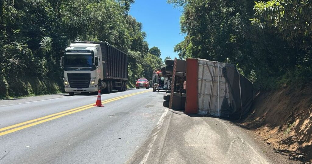 Tombamento de carreta é registrado na BR-476, em Paulo Frontin