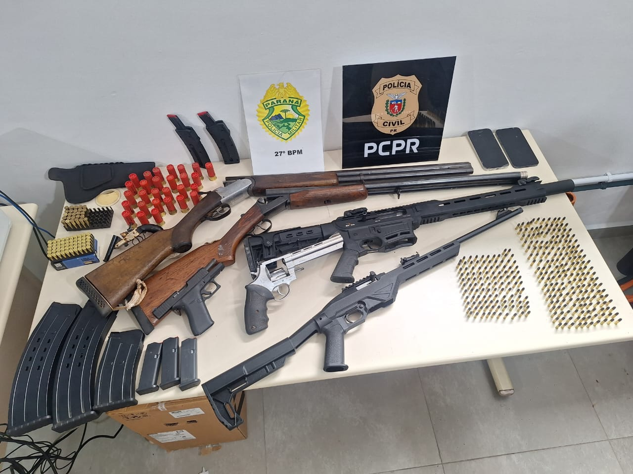 Durante as diligências, os policiais localizaram uma quantidade significativa de armamentos, entre eles revólver, pistola e espingardas de diferentes calibres, além de carregadores e grande volume de munições, incluindo itens de uso permitido e também de uso restrito. Aparelhos celulares também foram apreendidos.