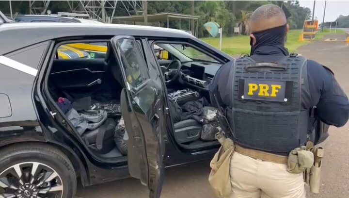 A abordagem ocorreu por volta das 7h30, quando os agentes deram ordem de parada a um veículo com placas de São Paulo. Durante a fiscalização, foram identificados diversos pacotes de skunk embalados a vácuo, visíveis no interior do carro, posicionados no assoalho e encobertos por sacos plásticos.