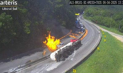 Carreta de combustível explode, deixa rastro de fogo e interdita Morro dos Cavalos na BR-101 em Palhoça
