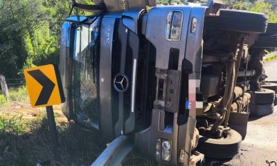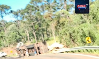 Na manhã desta sexta-feira (21), uma carreta carregada de madeira tombou às margens da PR-447, no quilômetro 29, na região conhecida como Kürten, em Cruz Machado...