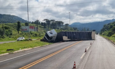 Uma carreta Mercedes-Benz de Santo Ângelo (RS), carregada com peças automotivas, tombou na BR-153, na entrada de General Carneiro por volta das 22h23min deste sábado (01°)....