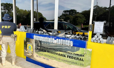 Fonte/Foto: Najuá A equipe da Polícia Rodoviária Federal (PRF) apreendeu um arsenal de armas na BR 277, em Guarapuava, e três pessoas foram presas em flagrante....